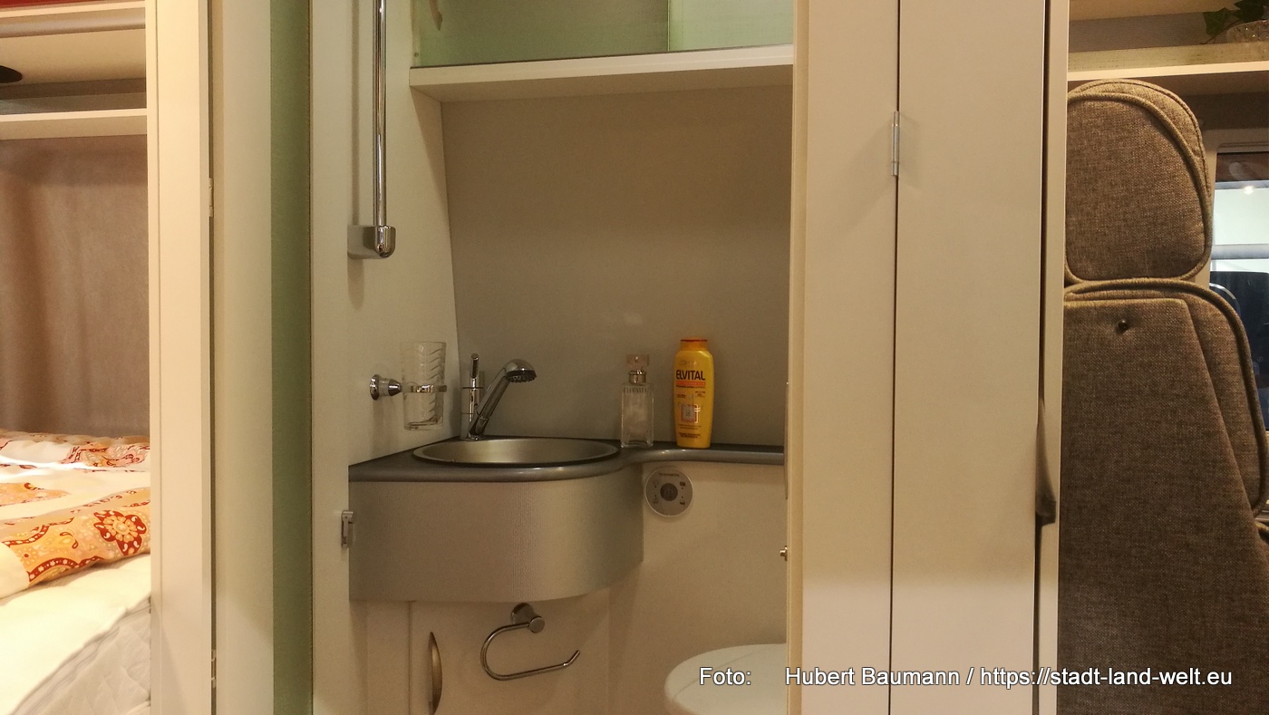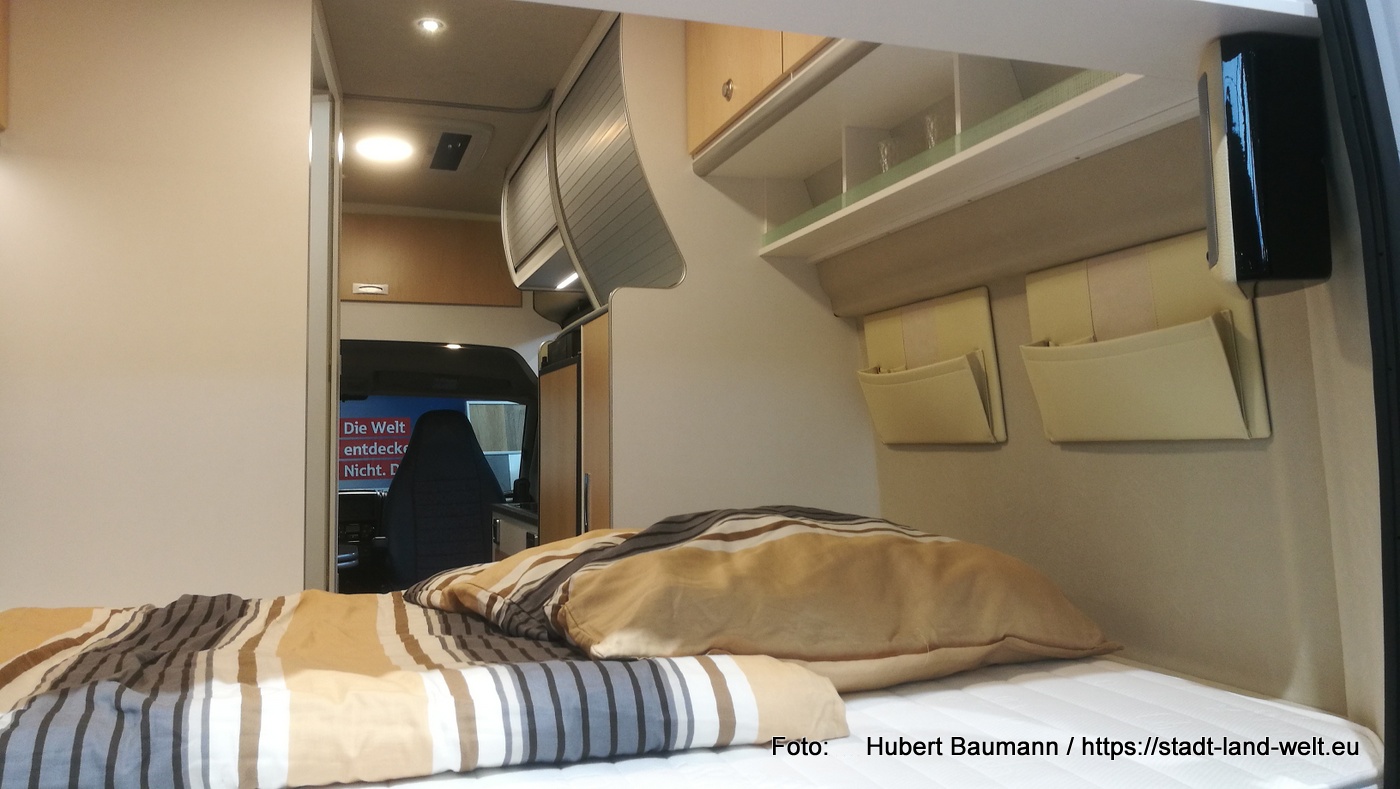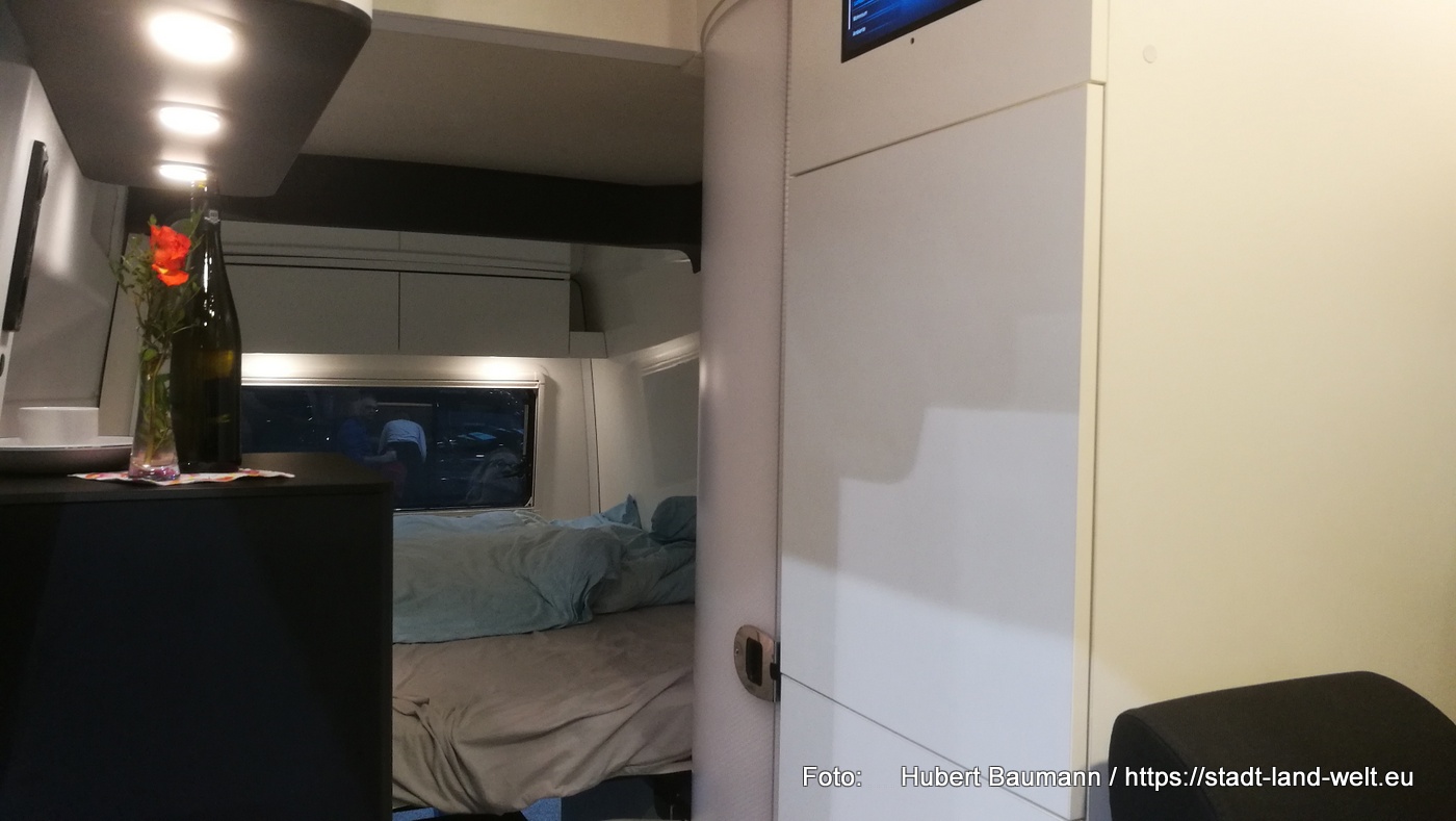 Ein Konzept ist praktisch gedacht und verzichtet auf überflüssigen Schnickschnack. Zum Duschen nutzt man die Außendusche. Die Toilette steckt in einer großen „Schublade“ unter dem Bett und für sein „großes Geschäft“ zieht man einfach die Vorhänge zu. Dafür gibt es viele praktische Taschen, die mit Kederschienen im Fahrzeug befestigt sind und die zu Hause zum Befüllen oder am Campingplatz zum Waschen gehen einfach komplett herausgenommen und mitgenommen werden können. Der Stauraum unter den Betten ist in voller Fahrzeugbreite nutzbar.