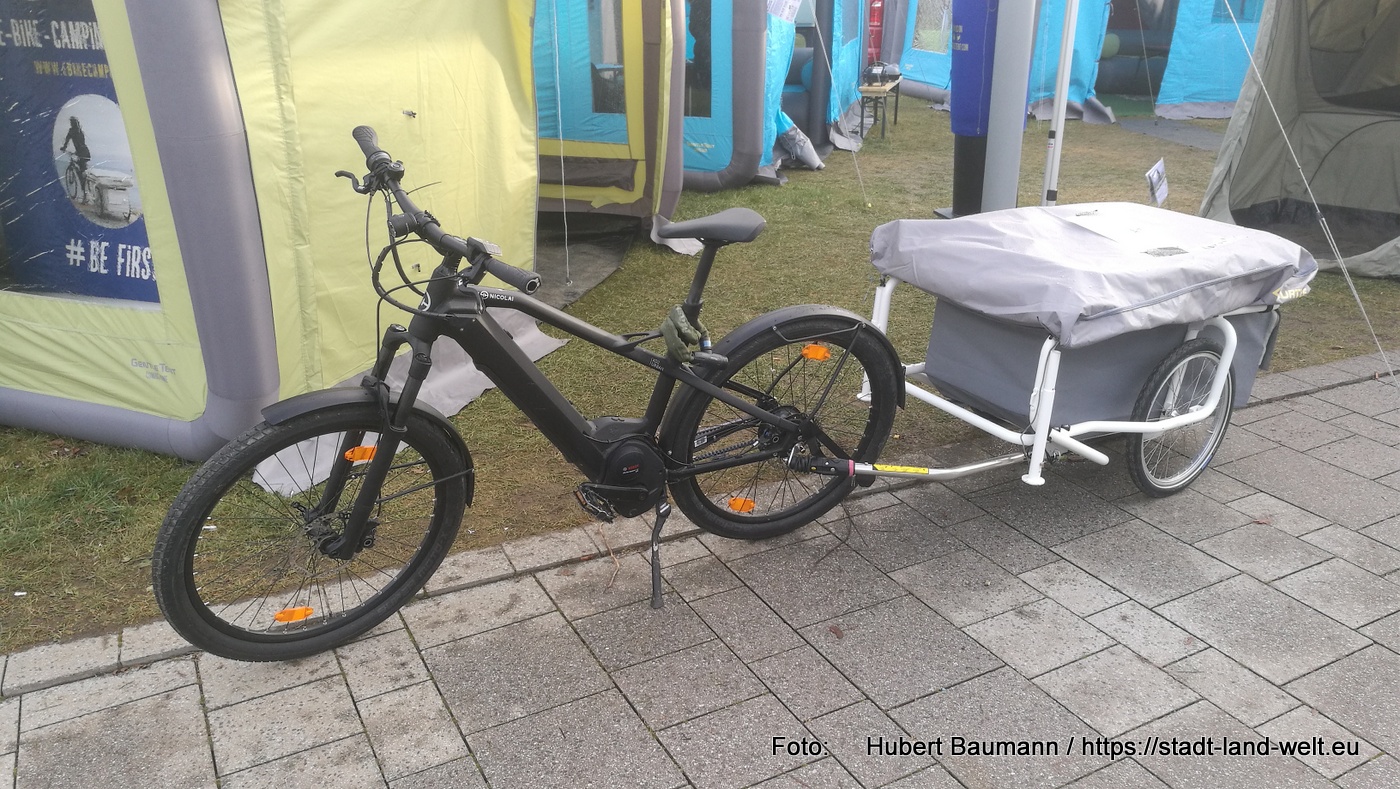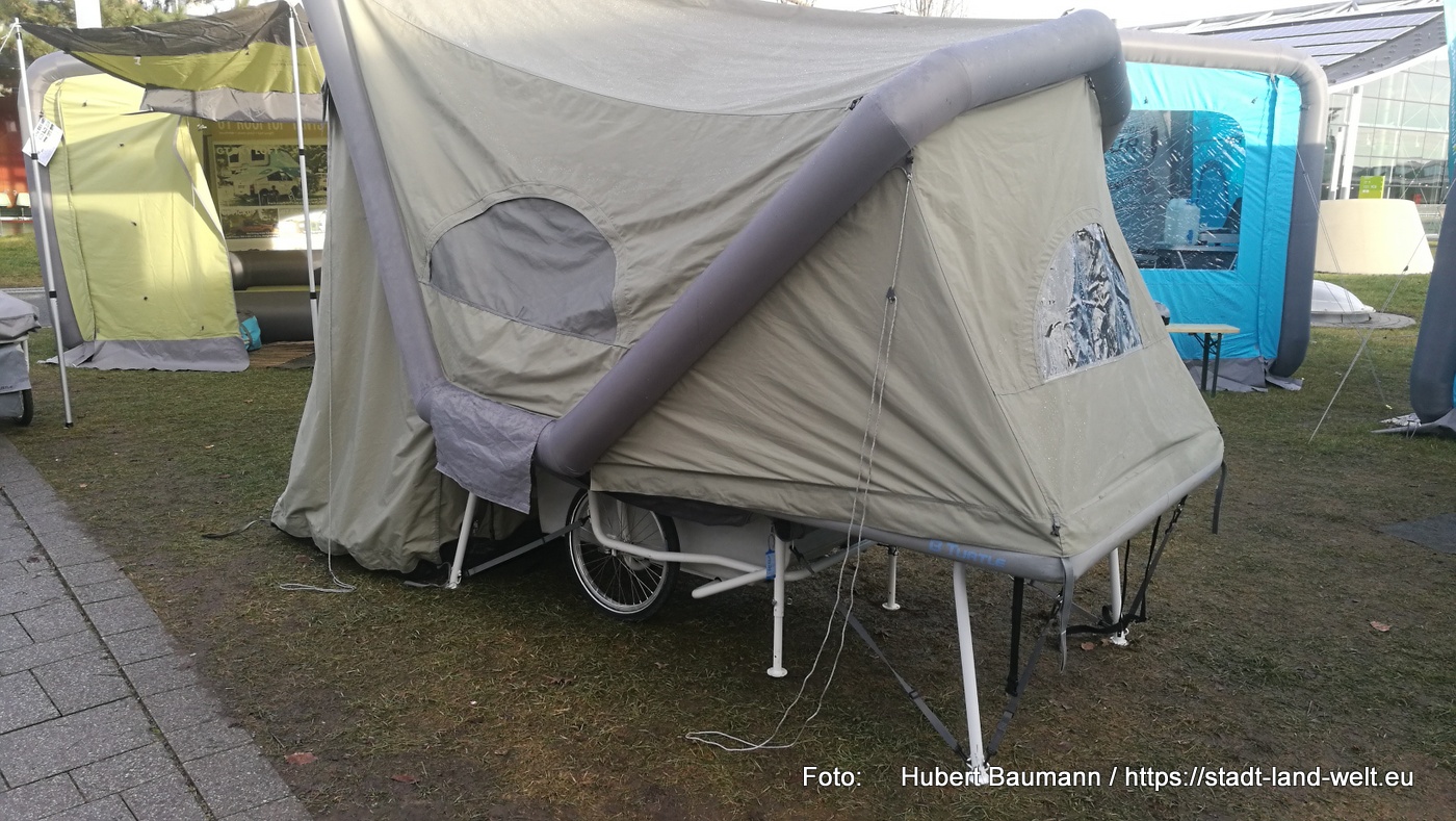 Auch Fahrradreisende müssen auf eine mobile Übernachtungsmöglichkeit nicht verzichten. Den Zeltanhänger für’s Fahrrad fand ich kurz vor meiner Weiterreise im Außenbereich. Mit rund 30 kg und für knapp unter 3.000 EUR hat man sein mobiles Schafzimmer für zwei Personen auch auf der Fahrradtour dabei.