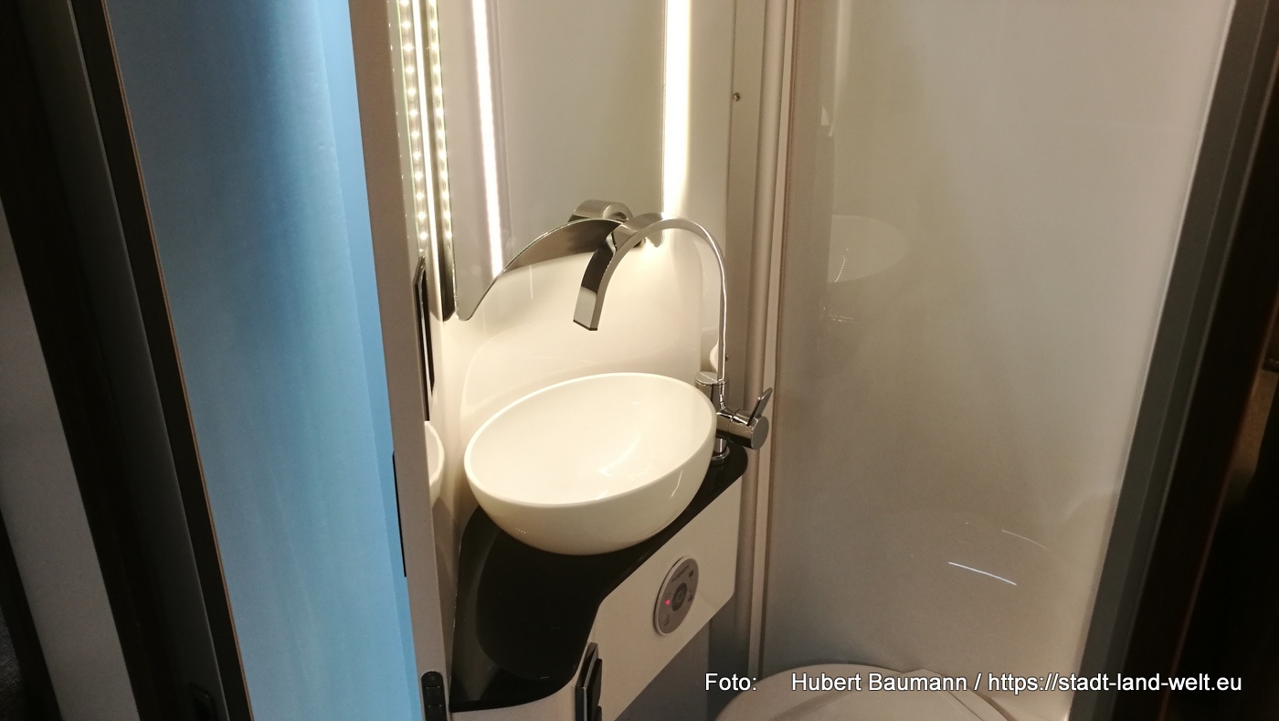 Den Kastenwagen mit Fahrrad im Heck fand ich auf dem Stand von Clever. Ebenfalls ein Fahrzeug mit 5, 40 m. Im vorderen Bereich des Fahrzeuges hat man eine Küche und eine großzügige Sitzgruppe.