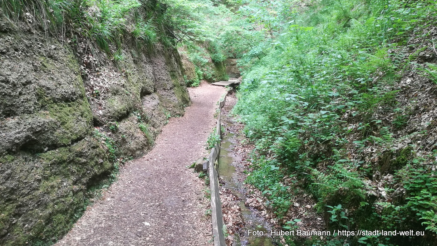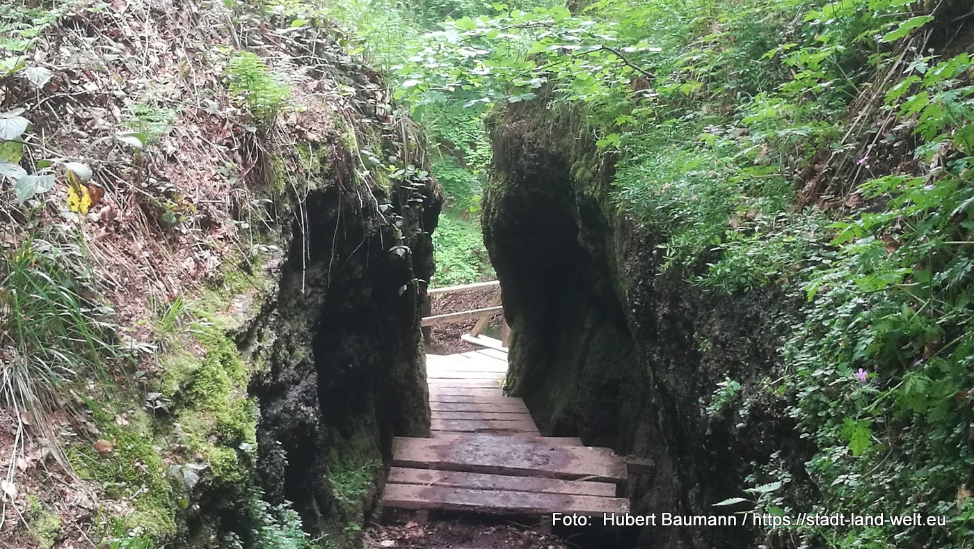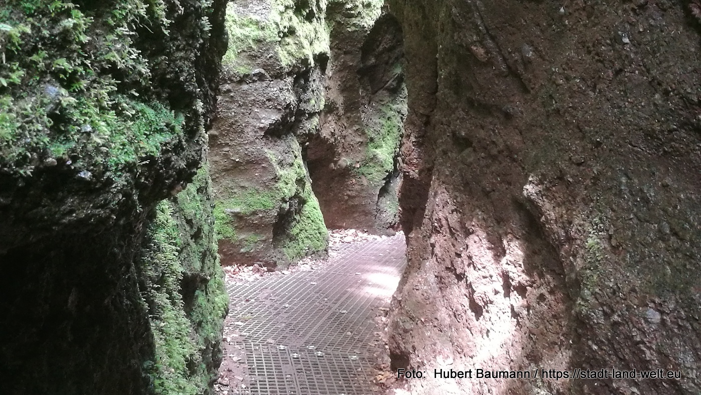 Den impossantesten Teil der Tour erlebt man in einem etwa 300 Meter langen Teilstück in der Drachenschlucht. Der Weg zwischen den Felsen ist dort teils so eng, dass man kaum aneinander vorbei kommt. Der Boden ist mit Gitterrosten ausgelegt. Darunter fließt der Bach. Bei starken Regenfällen kann es in diesem Bereich daher auch schnell nasse Füße geben und die Schlucht bleibt gesperrt. Den Weg durch diese Engstelle habe ich in einem kleinen Video festgehalten: