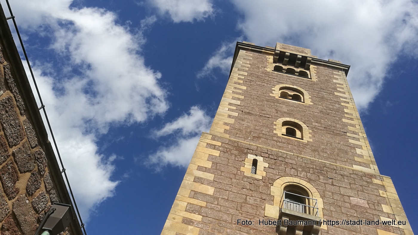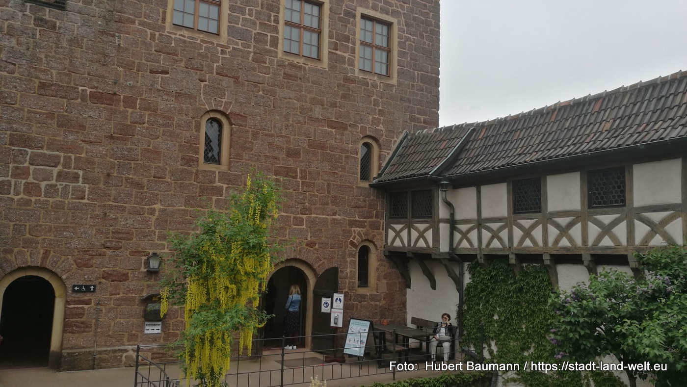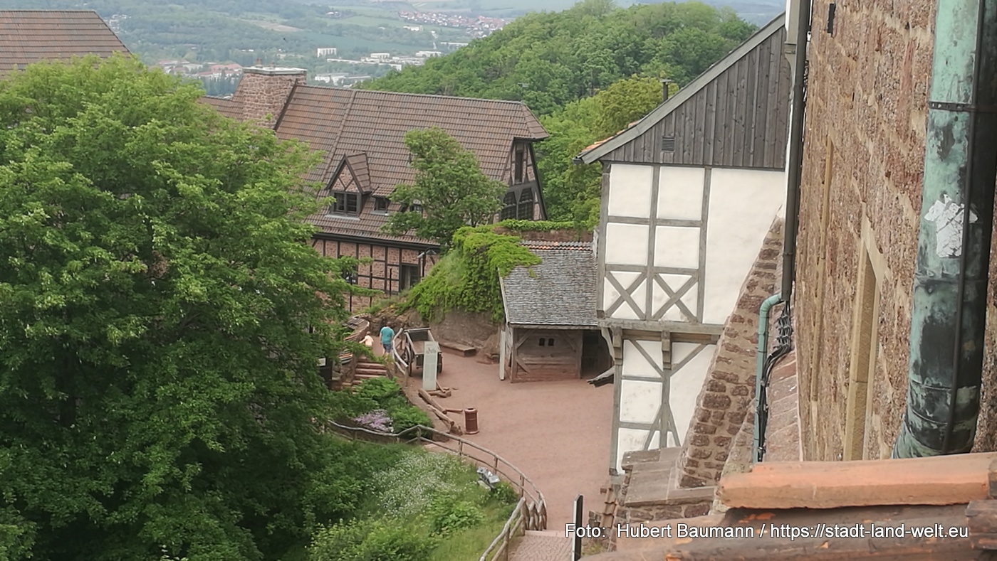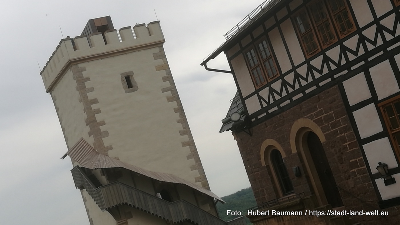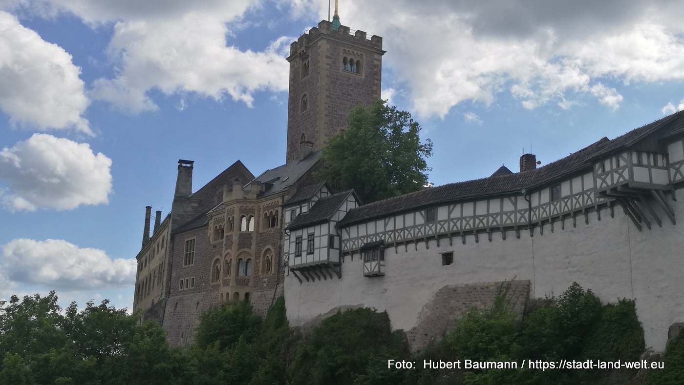 Von der Wartburg genießen wir den Blick auf Eisenach und die umliegenden Berge des Thüringer Waldes. Einer Sage nach ist der Bau der Burg nur durch eine List möglich gewesen. Graf Ludwig, der auf der Jagd diesen wunderschönen Fleck entdeckte, beabsichtigte dort eine Burg zu bauen. Das Problem: Ihm gehörte der Grund und Boden nicht. Er ließ von 12 Männern Erde von seinem eigenen Grund auf den Berg bringen und dort verteilen. Dann errichtete er die Burg auf seinem „eigenen“ Grund und Boden. Nachzulesen hier: https://de.wikipedia.org/wiki/Schwurschwerter_der_Wartburg. Auf der Burg hielt sich in den Jahren 1521/1522 auch der Reformator Martin Luther unter dem Namen „Junker Jörg“ versteckt.