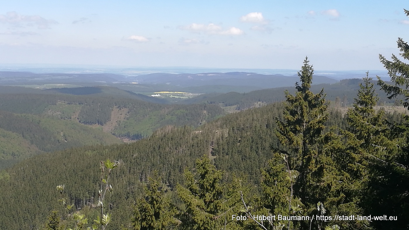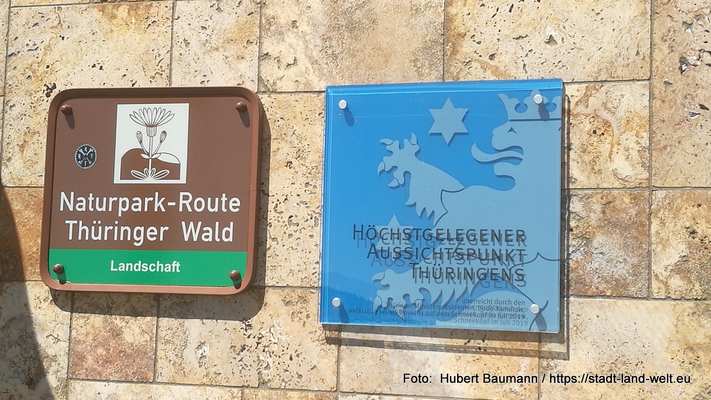 Der höchste Berg in Thüringen ist der Große Beerberg mit seinen 982,9 Metern über dem Meer. Er überragt damit den Schneekopf um knapp drei Meter. Dennoch kann man vom Schneekopf aus aus 1001 Meter Gesamthöhe die Thüringer Bergwelt bestaunen. Ein Turm an der höchsten Stelle des Berges macht dies möglich. Der Schneekopfturm kann wahlweise an der Außenseite beklettert oder über eine Treppe im Inneren bestiegen werden. Corona-bedingt hatte der Turm bei unserem Besuch allerdings geschlossen, sodass wir das Panorama von dem Plateau des Schneekopfes aus genießen durften.
