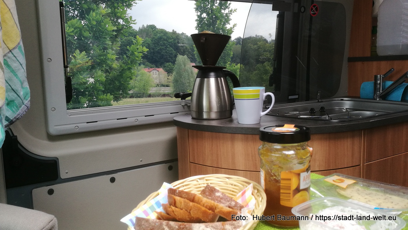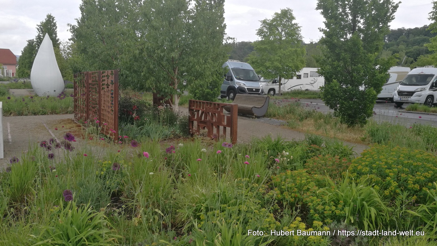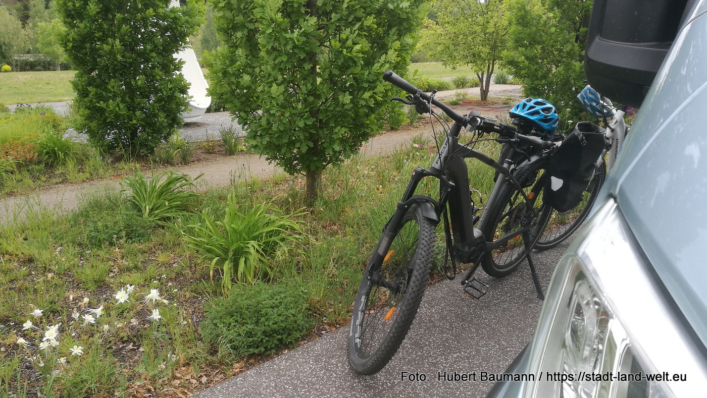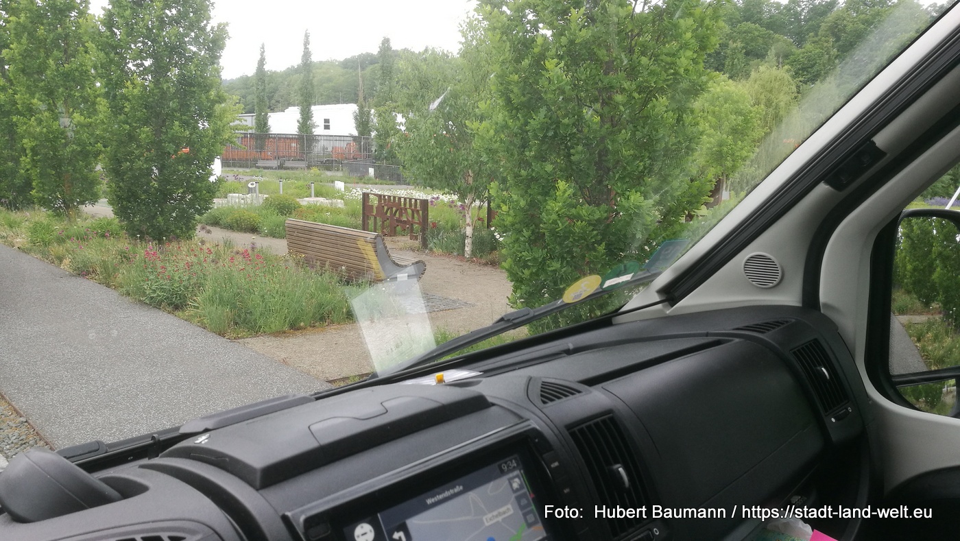Unser Basislager hatten wir an diesem Tag am Wohnmobilstellplatz in Schmalkalden eingerichtet. Ein kleiner Stellplatz für ca. 10 Mobile mit kompletter Ver- und Entsorgung. Pauschale 10,00 EUR für 24 Stunden am Automaten. Der Platz liegt direkt am ehemaligen Buga-Gelände. Uns trennte damit nur ein Stückchen Gehsteig von der Grünanlage. In den Mommelstein-Radweg kann man ebenfalls direkt am Platz einsteigen.