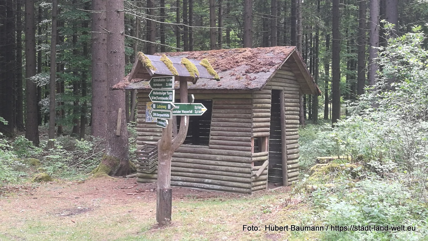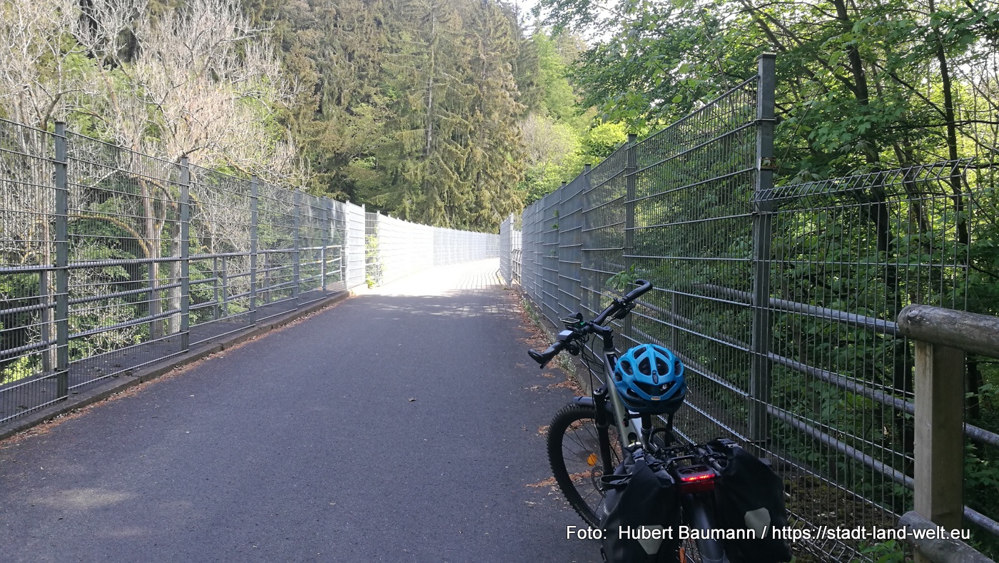 In Klein-Schmalkalden macht die Bahntrasse eine Kehre nach links und zieht sich von da an noch etwas steiler den Berghang hoch in Richtung Trusetal bis man nach ca 1 – 2 km von einem Umleitungsschild gebremst wird. Der weitere Verlauf der Bahntrasse ist wegen eines Steinschlages gesperrt.