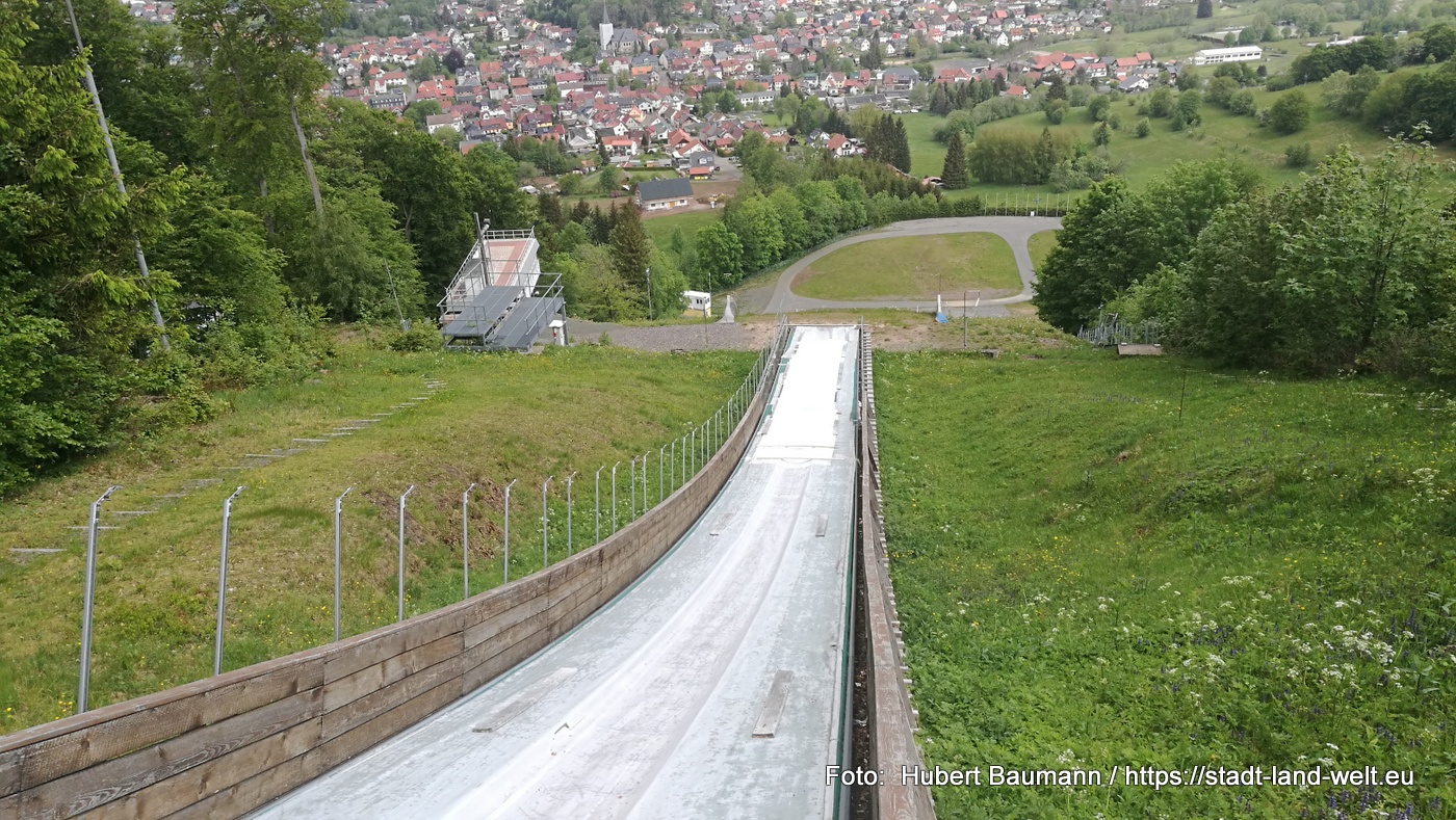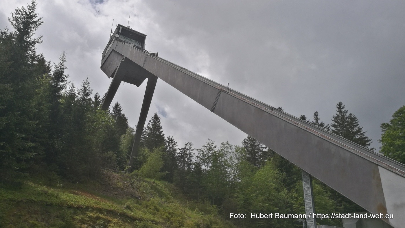 Wir müssen eine Umleitung nehmen und beschließen von hier an dem Mommelstein-Radweg weiter zu folgen, die uns rund um den Mommelstein und zur Skisprungschanze in Brotterode führt. Ab dem Umleitungsschild wurde der Weg jedoch deutlich unwegsamer. Es war eher ein steiniger Wanderweg. Von der Gemütlichkeit der Bahntrasse nichts mehr zu spüren. Und der Weg war deutlich schlechter ausgeschildert. Zum Glück waren einheimische Spaziergänger unterwegs, die wir nach dem Weg fragen konnten.