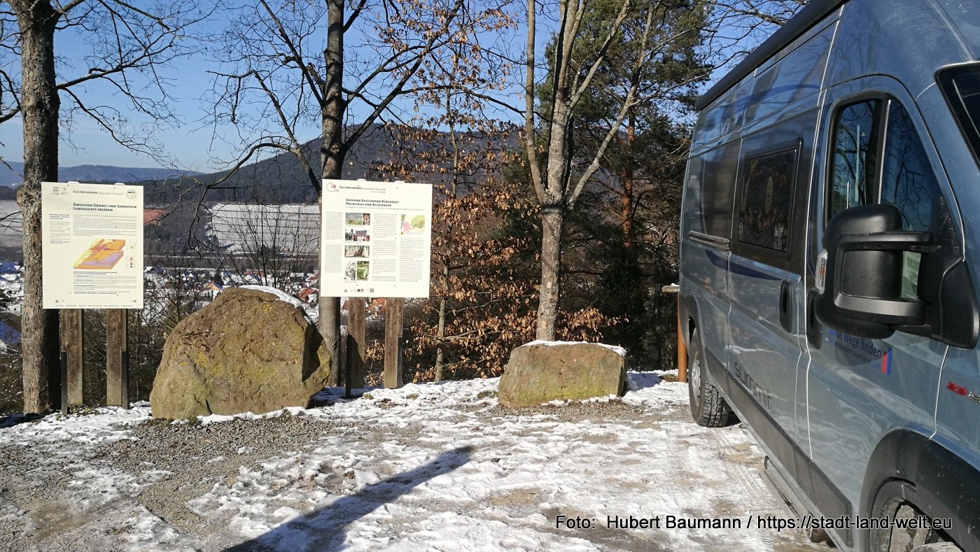 Wir haben tagsüber an dem Parkplatz Stutz mit einer herrlichen Fernsicht gestanden. Anfahrt für große Mobile eher weniger geeignet. Kastenwagen geht. Zum Übernachten bietet sich der kostenlose WoMo-Stellplatz in Bürgstadt an. Komplette Infrastruktur (V+E) vorhanden. Wer es etwas „städtischer“ haben möchte, findet auch mehrere (ebenfalls kostenlose) Plätze in Miltenberg.