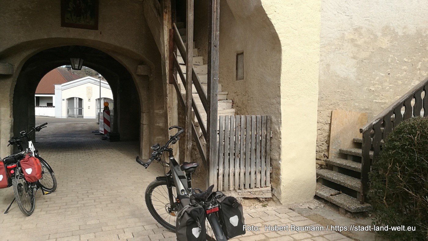 Der erste Etappenabschnitt führt uns mit dem Fahrrad von Wellheim über eine alte Bahntrasse zunächst nach Dollnstein, einem kleinen Ort an der Altmühl, teilweise noch umgeben mit Stadtmauer.