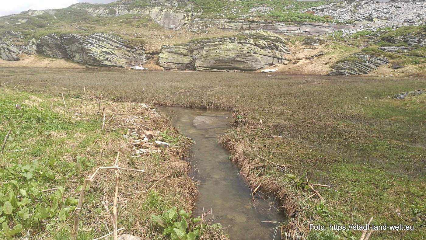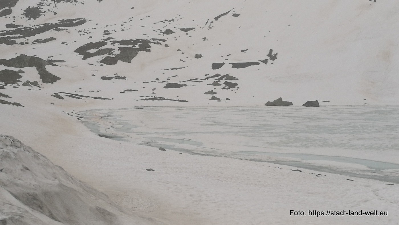 Der kleine See auf der Passhöhe ist noch weitgehend zugefroren. Auch sonst ist es in dieser Höhe deutlich kühler als unten im Tal.
