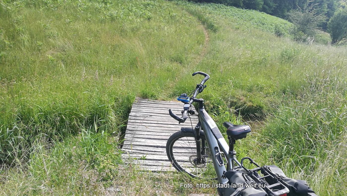 Der Weg im Aubachtal ist weitgehend gut bis mäßig befahrbarer Waldweg. Auf der Route, die ich mir herausgesucht hatte, musste ich jedoch ein Stück schieben, weil es steil bergab, über den Aubach hinweg und auf der anderen Seite wieder steil hoch ging.