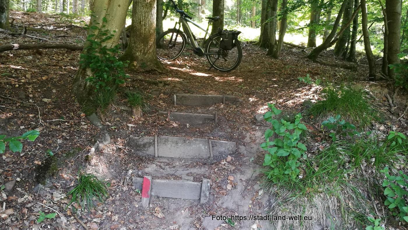 Die ersten 300 m Abstieg sind für normale Tourenradler auch eher ungeeignet. Also besser absteigen und schieben – auch wenn es uncool erscheint. Dann geht es weiter auf einem wieder besser ausgebauten Weg bis zum Ortseingang Wiesen im Landkreis Aschaffenburg.
